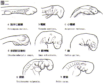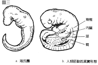 相反地,笔者十年前凭著蚯蚓与人类都是由一位造物主所造的信心,首创用蚯蚓作重金属污染的实验。其结果与用老鼠作的实验可以比对,与在人体的观察也非常相似。现在蚯蚓的模式已渐渐受环保及毒理学人重视。所以,在科学探讨中,动物“同源的假设”(不是已证的事实),完全可用“同一设计”的理论模式代替。换句话说,进化与创造的模式在实验科学上同样可用,但进化论理论本身却是哲学上的推论。生物学不需进化论为主导。 注二:所有脊椎动物的胚胎不是都有鳃,而是都有咽囊(phyraygeal pouches)。鱼类的咽囊发育为鳃,但在其他动物中咽囊发育成与鳃无关的结构,如内耳,和副甲状腺等。人类有尾的传说,有一部份由海克尔伪造的图而来。从图三清楚可见海克尔将脚的胚芽画成尾芽,不少人就为自己想像出尾巴来。 注三:笔者1999年暑期在中国曾接受北京某出版社副编的专访,其中问及人和鱼的胚胎比较。我建议在中学课本中删除海克尔的图画。据说这项更正在两年内可能完成。若果真如此,中国在教材上的改进要跑在英、美的前面。